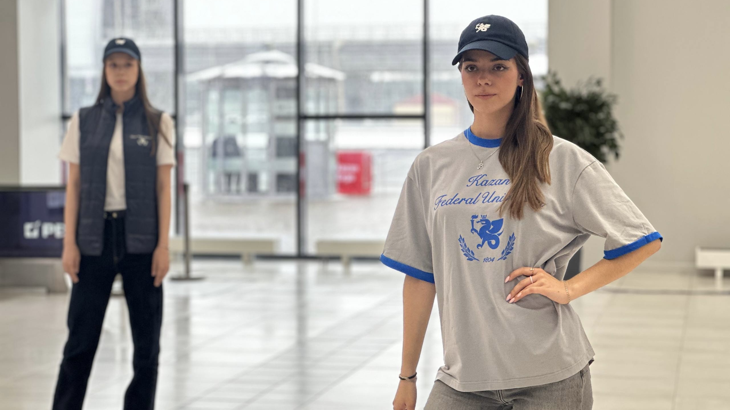 На моделях была представлена футболка из базовой линейки. Цвет – синий, красный или зеленый – указывает на принадлежность к определенному направлению обучения в вузе. На логотипе Казанского федерального изображен Зилант – мифологический страж Казани и символ университета, который держит факел знаний – символ просвещения, а также значимая для вуза цифра – 1804, год основания Казанского университета.