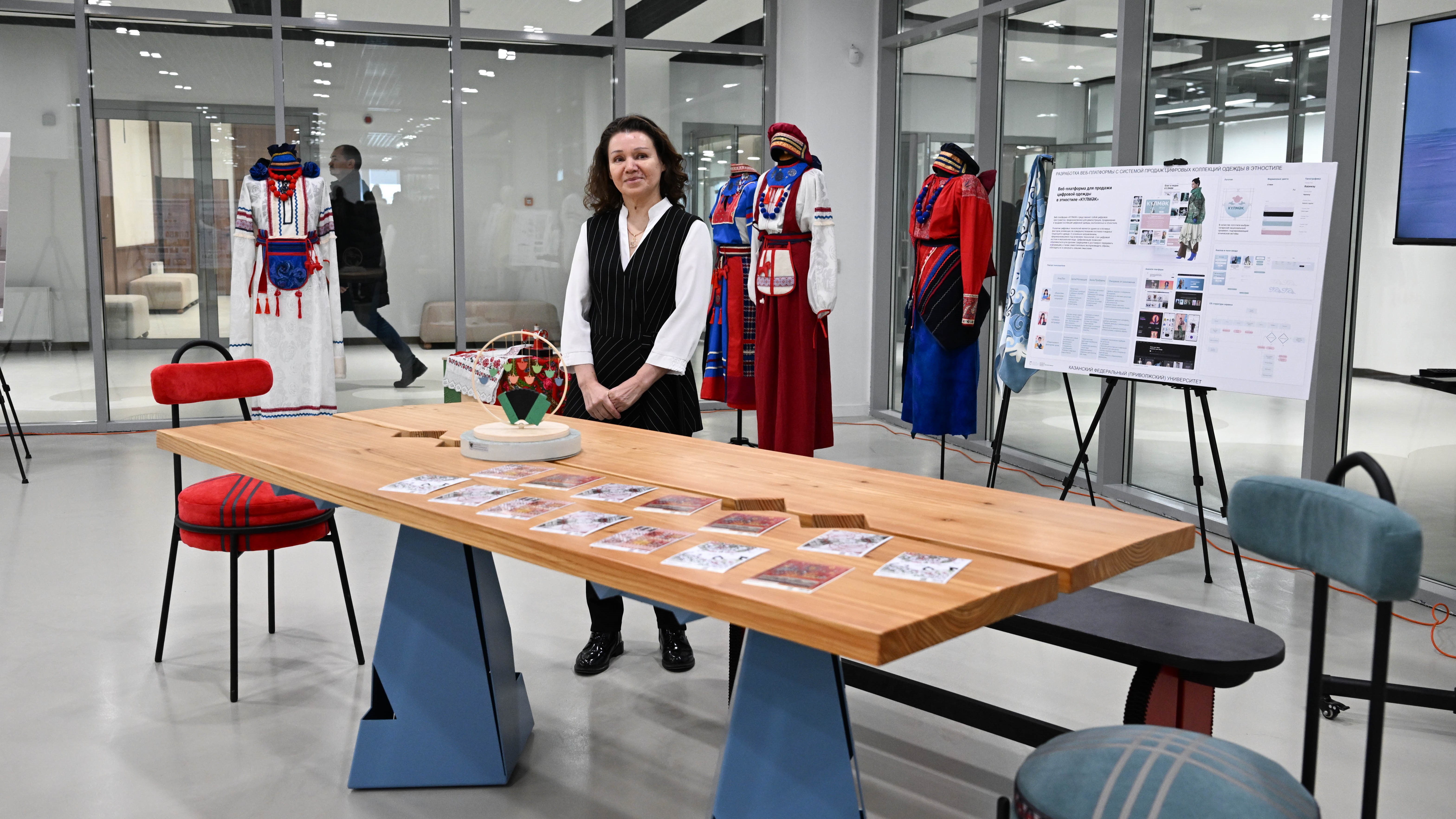 Была показана коллекция национальной мебели магистрантки Эльвиры Мингалимовой – победительницы конкурса «Студенческий стартап», разработанная с учетом традиций и орнаментов Татарстана и выполненная из экологичных материалов. Руководитель – заведующий кафедрой архитектуры и медиаискусства ИДиПИ Степан Новиков.