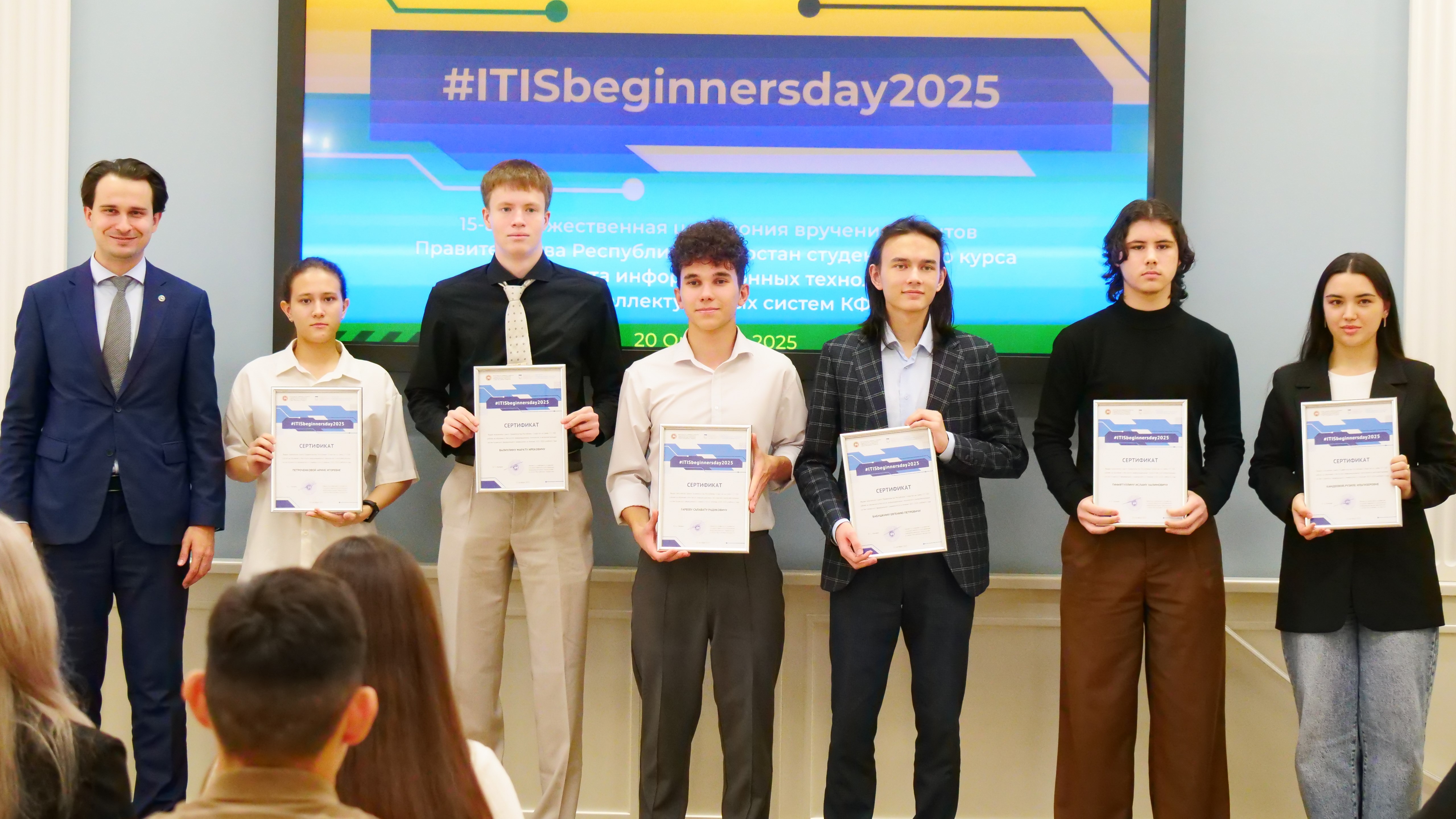 30 студентов 1 курса Института информационных технологий и интеллектуальных систем Казанского федерального университета официально стали обладателями грантов на обучение в сфере ИТ. На церемонии присутствовали заместитель министра цифрового развития государственного управления, информационных технологий и связи Республики Татарстан Булат Габдрахманов и первый проректор – проректор по научной деятельности КФУ Дмитрий Таюрский.