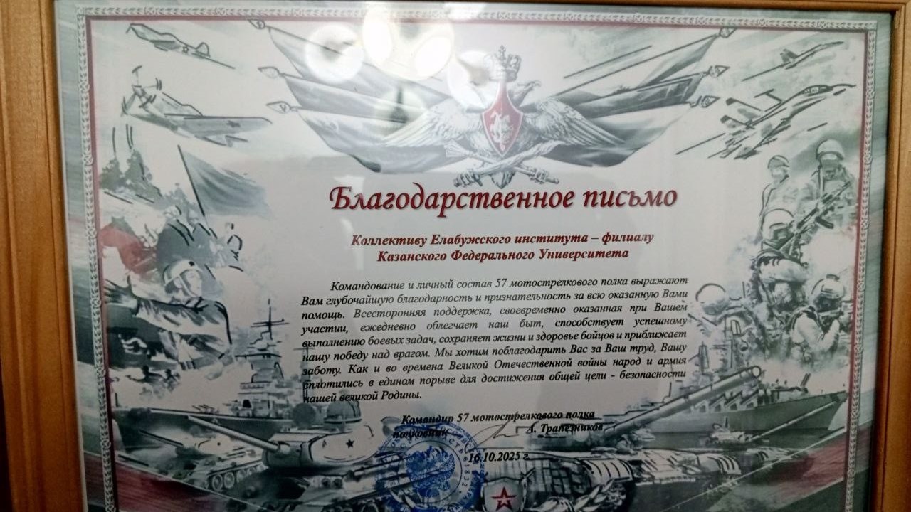 Елабужский институт Казанского федерального университета продолжает активно участвовать в акции Минобрнауки России «Вузы для фронта!». В рамках празднования Дня волонтера в ЦКР «Созвездие» коллектив получил официальные благодарственные письма от командиров батальона «Тимер» и 57-го мотострелкового полка.